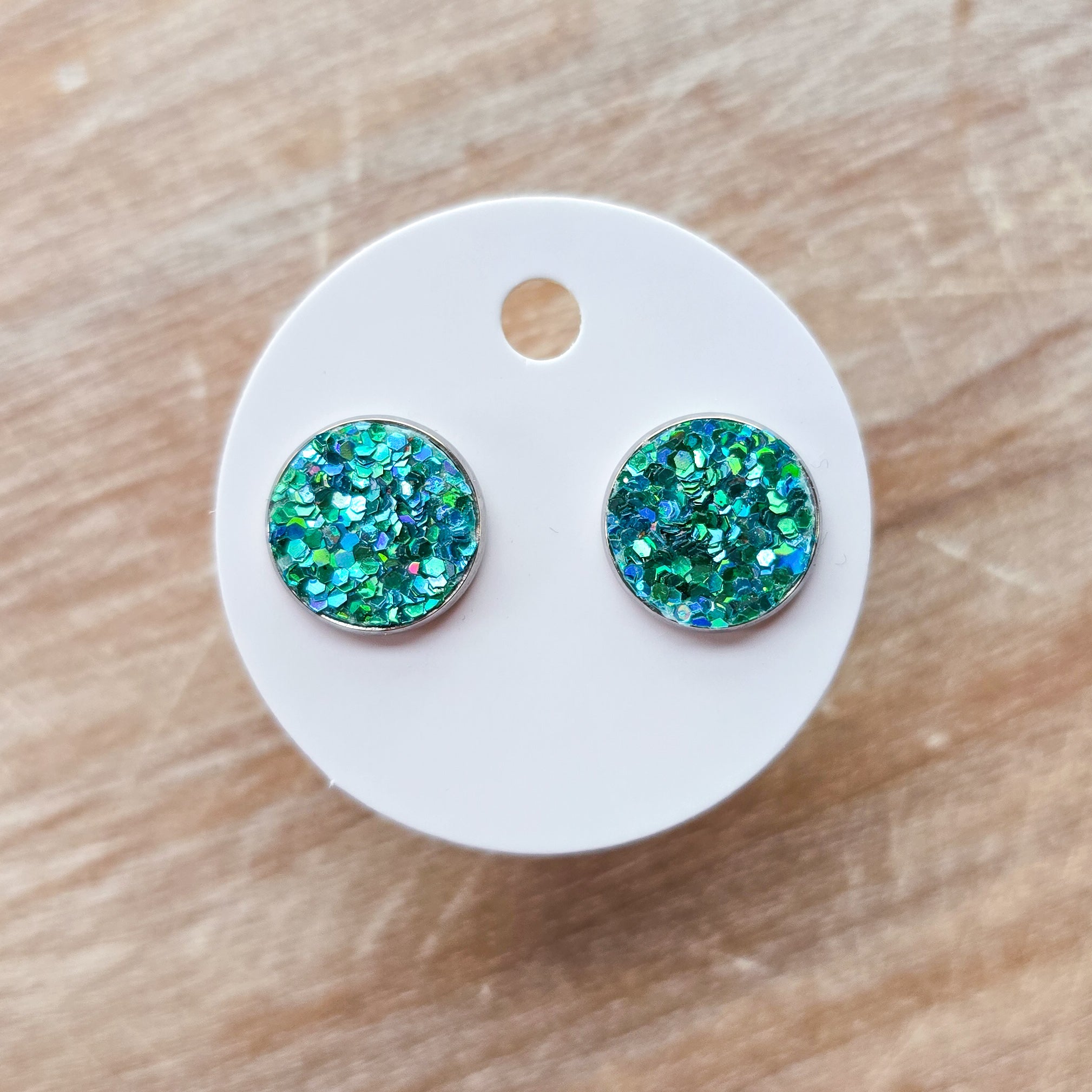 Earrings are made of high quality glitter backed with genuine leather in stainless steel stud settings.