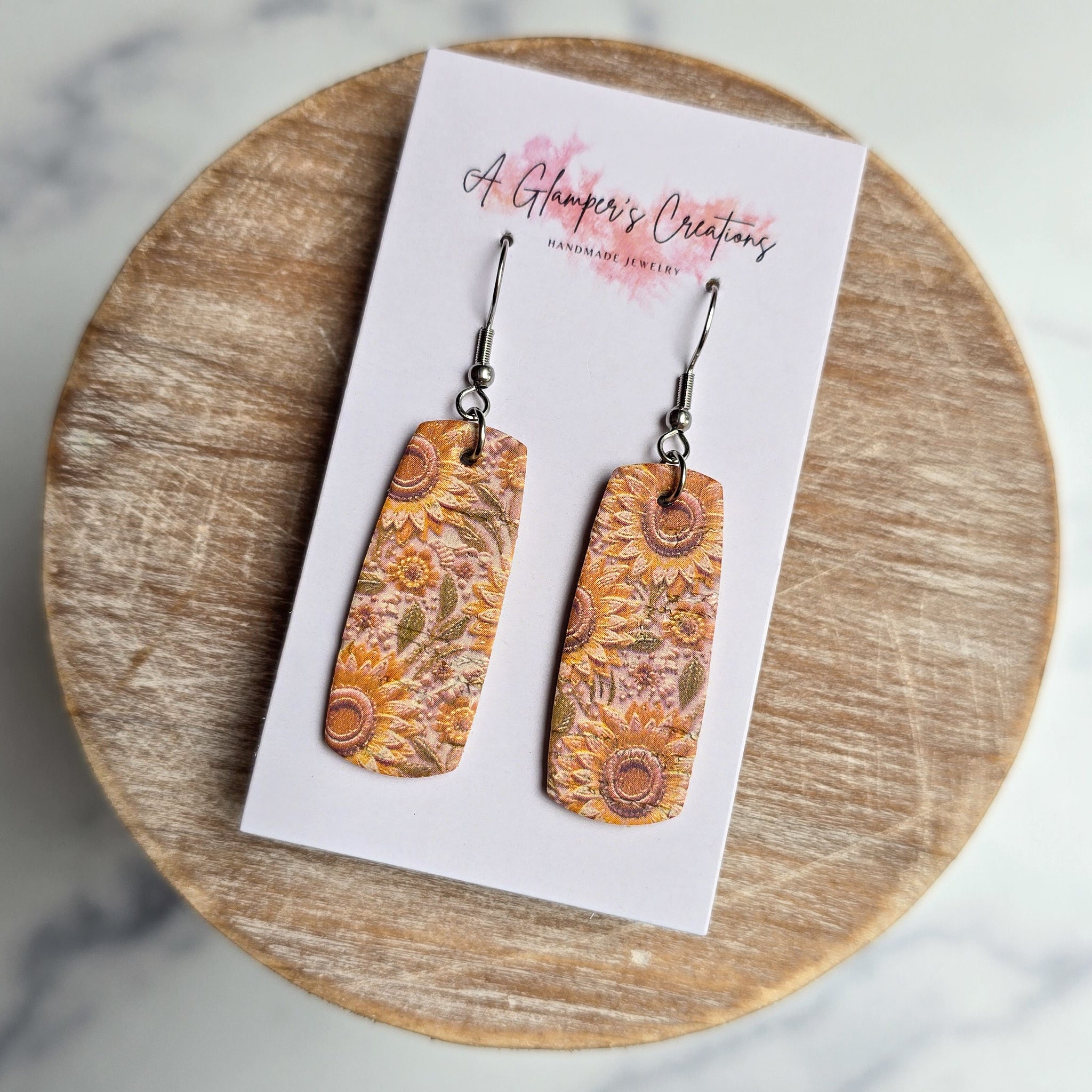 These Yellow Sunflower Mini Bar Earrings are the perfect fall accessory! Measuring 1.5 inches long, they feature cork backed with genuine leather and stainless steel earring hooks. Ready to ship and sure to add a touch of charm to any outfit. Order now and brighten up your wardrobe!